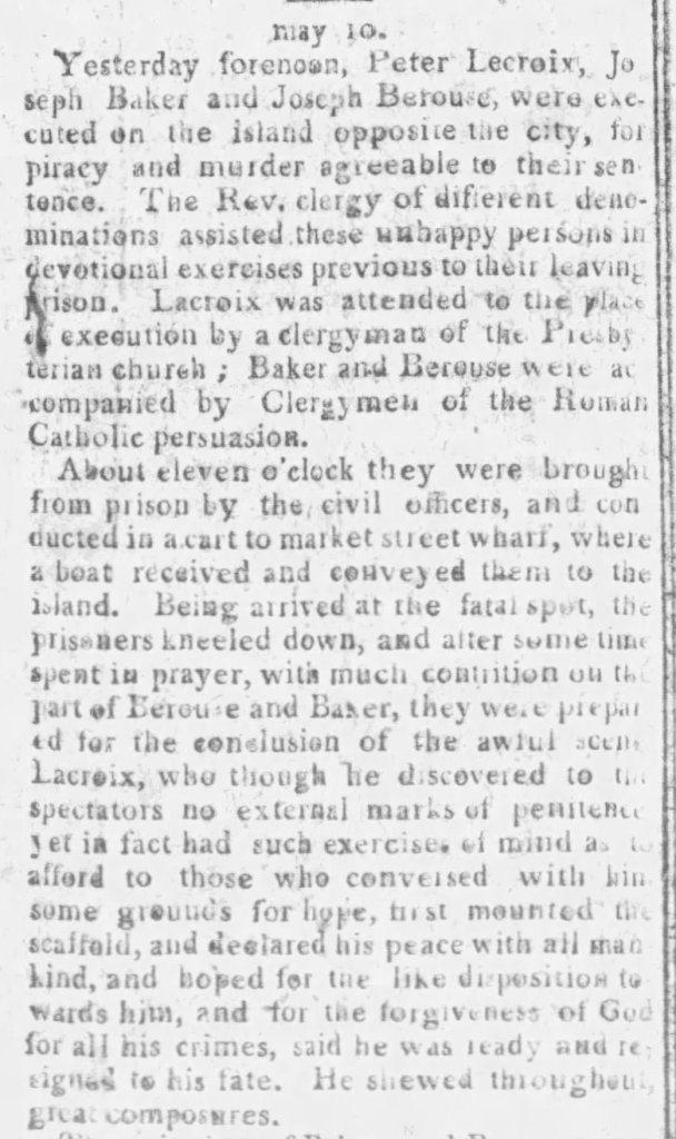 Baker, Berouse, and LeCroix hanged together on a small island in the Delaware River before a large onshore crowd on May 9, 1800.