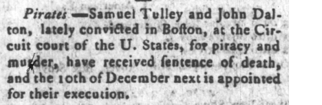 After his conviction was upheld on appeal (United States v. Tully, 28 F. Cas. 226, 1812), Samuel Tully was hanged in South Boston on December 10, 1812. In a remarkable display of both terror and mercy, John Dalton’s execution was reprieved on the gallows. He was pardon in July 1813 and released from prison.