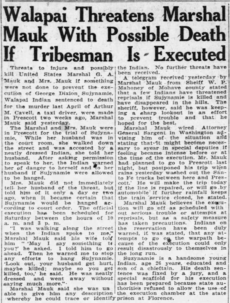 George Sujynamie, a 19-year old Hualapai tribe member, was arrested for the murder of Arthur M. Cavell, a white taxi driver, who was beaten to death in April 1925, on the Fort Whipple Reservation, near Prescott, Arizona. Sujynamie then stole Cavell’s taxi. He was arrested hours after the killing.