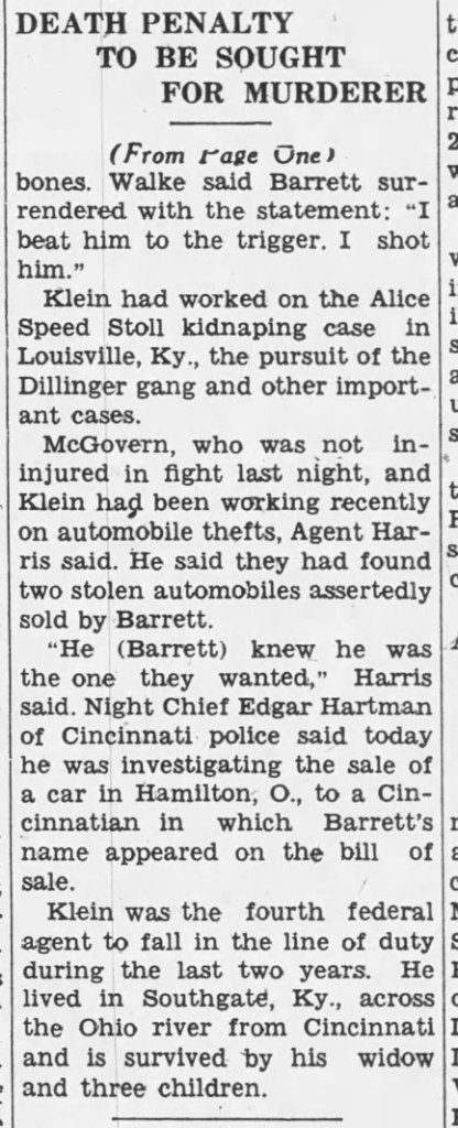 George W. Barrett had a long criminal history, including having killed his mother and shot his sister. That career culminated on August 16, 1935, when two Federal Bureau of Investigation (FBI) agents investigating a series of car thefts tracked him to College Corner, Ohio, very near the Indiana border. The effort to apprehend him led to a shoot out in which agent Nelson B. Klein was shot and killed and agent Donald McGovern was wounded.