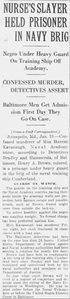 Harriet M. Kavanaugh was a nurse at the Naval Academy Hospital in Annapolis, Maryland, when she was robbed and badly beaten on January 14, 1921. She died the next day. The initial investigation focused on two white men.
