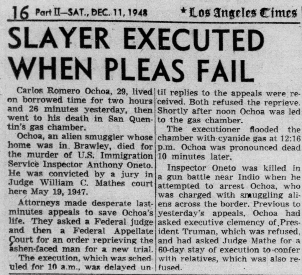 Ochoa’s conviction was affirmed on appeal and he was executed in the gas chamber at San Quentin State Prison on December 10, 1948.