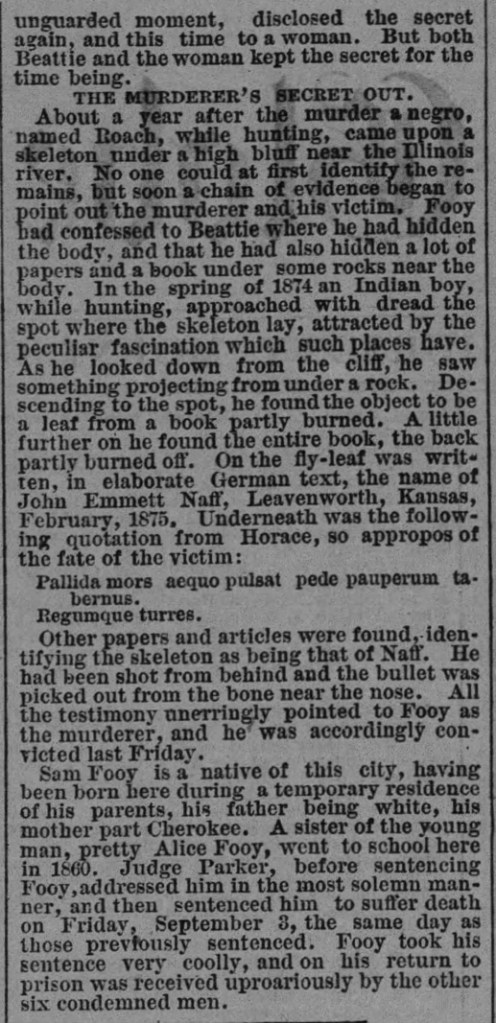 John Emmett Naff was a teacher near Tahlequah, in Indian Territory. With his pay in his pocket, Naff was last seen traveling by foot with Samuel Fooy on July 17, 1875.
