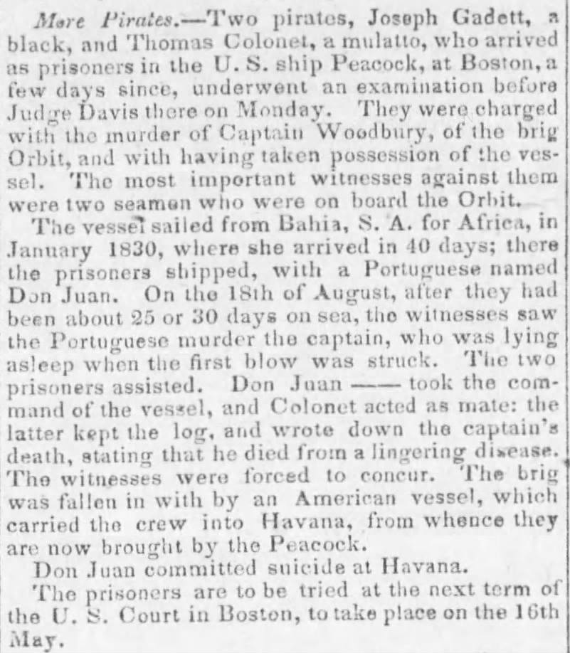 On trial for piracy in federal court, the two men confessed. They were convicted and sentenced to death. Joseph Gadett and Thomas Collinet were hanged together in Boston on July 1, 1831.