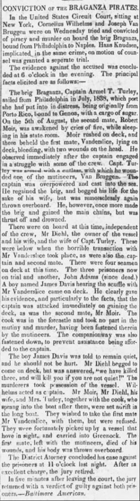 At trial in U.S. District Court in New York City on 1, May 1839, Wilhelms, who was Dutch, was convicted of murder on the high seas and sentenced to death. The Belgian Verbruggen was also convicted and sentenced to death. Knudsen was tried and acquitted the next day.