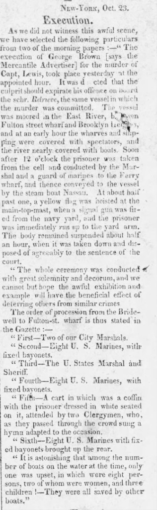 George Brown was hanged onboard the Retrieve anchored amidst numerous boats carrying onlookers in the East River on October 22, 1819.