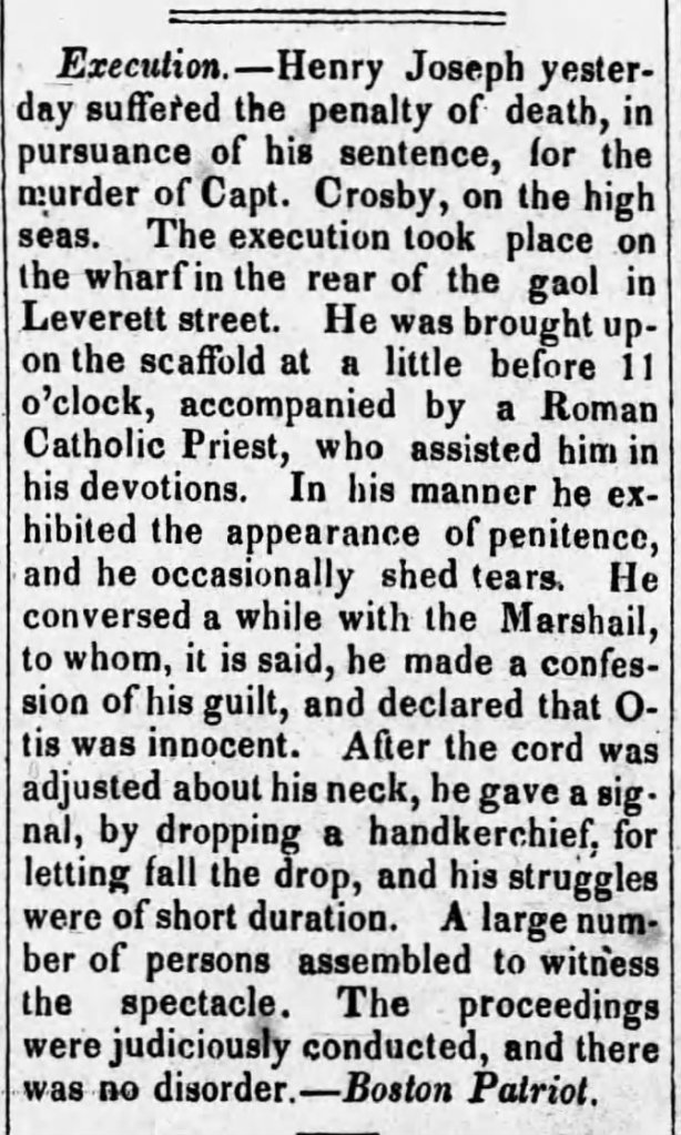 Henry Joseph was hanged in Boston before a large crowd on December 5, 1834. From the gallows, Joseph again confessed his guilt and Otis’s innocence.