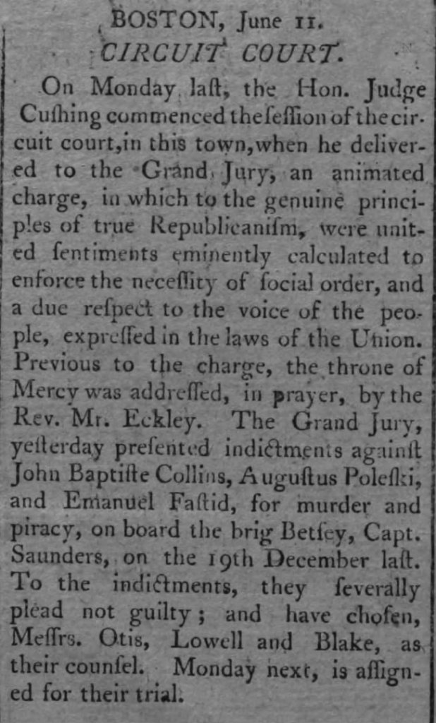John Baptiste Collins, Emanuel Fastidi, and Augustus Poleski were hanged in Boston on July 30, 1794. A large crowd witnessed the spectacle.