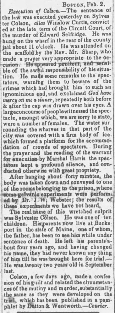 On the gallows, Sylvester Colson confessed to his role in the crime. He was hanged in the yard of the Leverett Street Prison in Boston on February 1, 1827