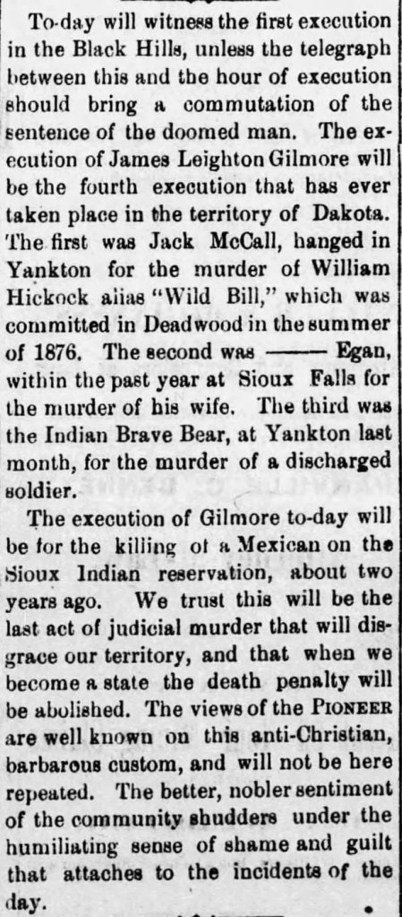 Though it was widely expected that his connections would ultimately spare him, James Gilmore was hanged in Deadwood on December 15, 1882. The Daily Deadwood Pioneer Times of that date described it as “the first judicial murder in the Black Hills.”