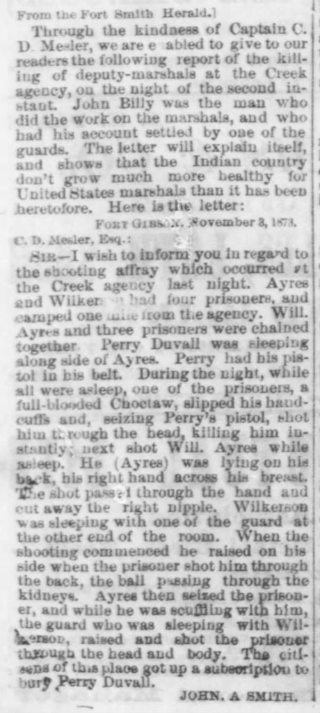 On November 2, 1873, while being transported to Fort Smith to stand trial for assault, John Billy, a member and resident of the Choctaw Nation, was able to escape custody, steal the gun of one of the U.S. Marshals holding him, and kill two of those officers, Willard Ayers and Perry Duval. A third officer – Ed Grayson – shot and wounded Billy.