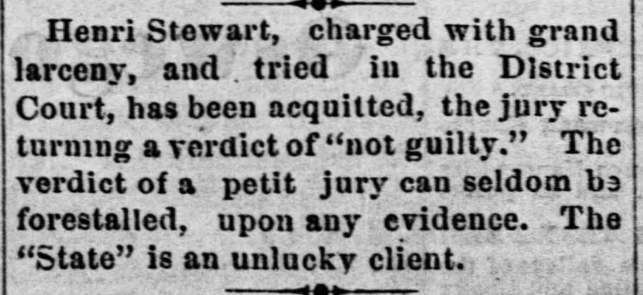 The Stewarts then fled. Henri Stewart was arrested in Missouri on August 30, 1878. Transported to Fort Smith, he was convicted and sentenced to death in June 1879.