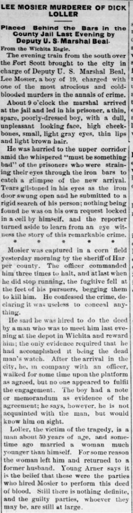 Lee Mosier and Robert Arner were traveling with Hugh Benton Lawler on a trip from Anthony, in Indian Territory, to Kansas, on October 27, 1886. Without warning or provocation, Mosier, who was 20-years old, shot and killed Lawler. He then drove off with Lawler’s wagon while Arner escaped. The killing occurred within Indian Territory.