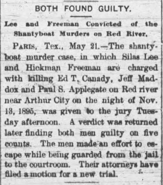 Silas Lee and Hickman Freeman, Black men who lived in the Indian Territory near Goodland, killed Ed Canady, Paul Applegate, Jeff Maddox, and an unidentified man on November 14, 1895. The four men were on a boat in the Red River near Arthur City. The motive was robbery.