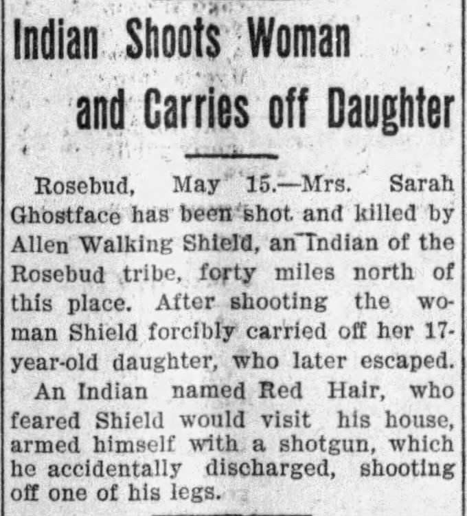 Sarah Ghost Face Bear did not approve of Allen Walking Shield’s interest in her 16-year old daughter, Mabel. As a result, on May 9, 1902, Walking Shield killed Ghost Face Bear at her home along the Little White River, near Westover, South Dakota, and fled with Mabel.