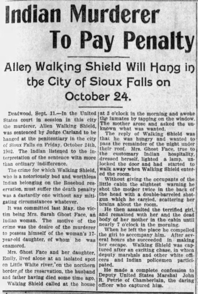 On trial in federal court in Deadwood, South Dakota, Walking Shield was convicted of murder on September 11, 1902, and sentenced to death on the same day.